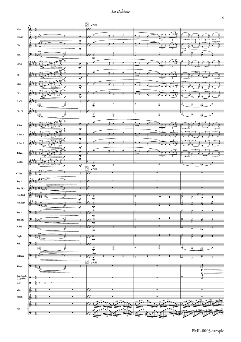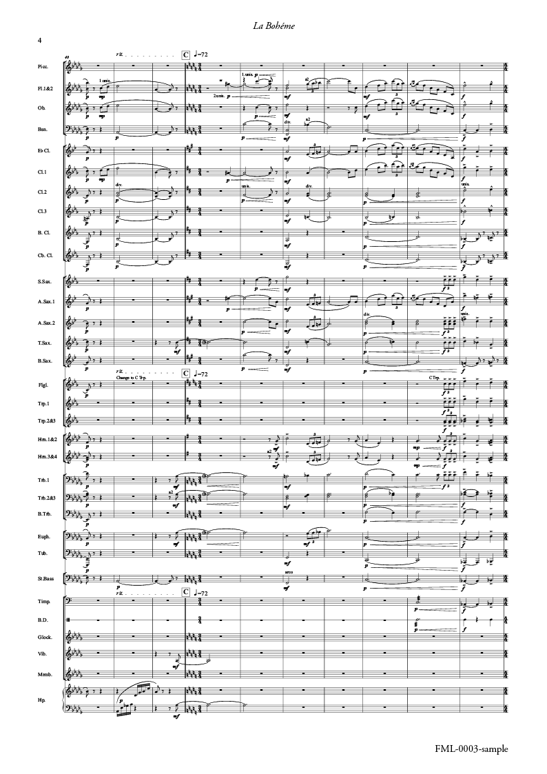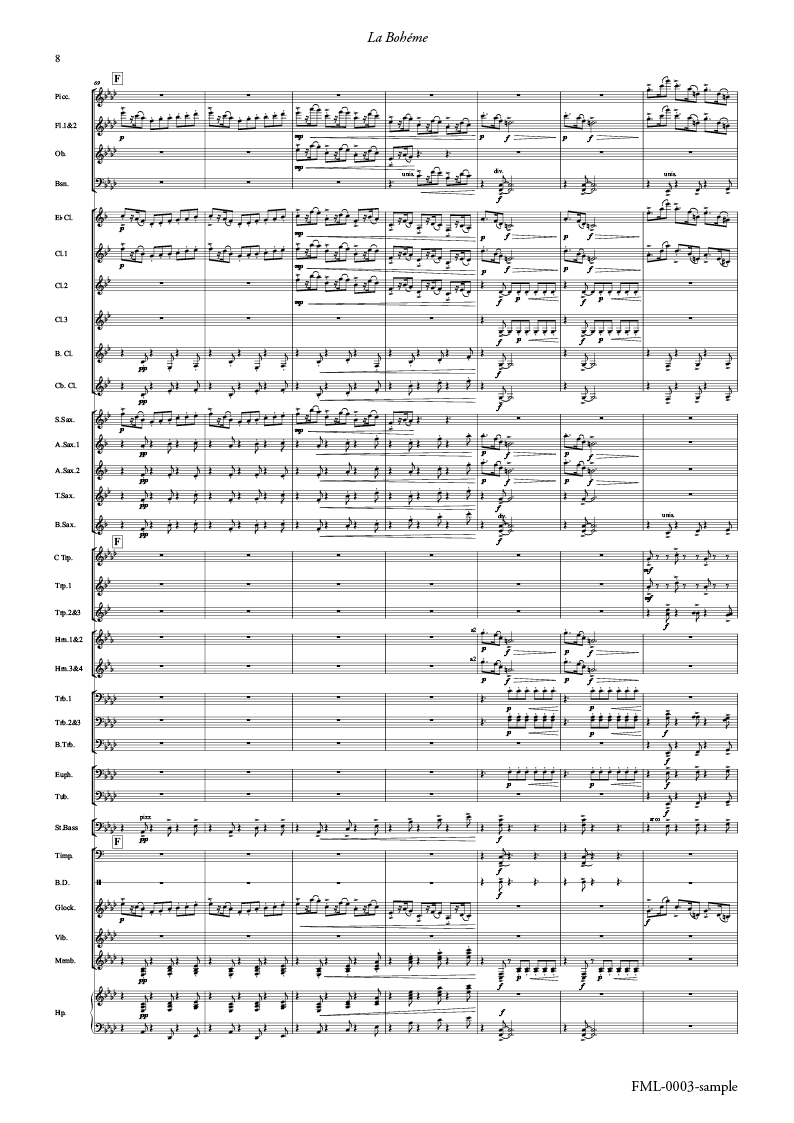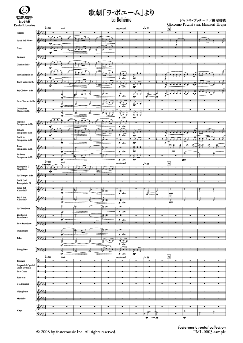 この編曲には、「冷たい手を」「おや!ムゼッタだ!」「ガヴォットだ!メヌエットだ!」「私の名はミミ」を取り上げ、1 曲にまとめてあります。演奏する場合、各場面を分けて考えるのではなく、1 曲の曲として演奏してください。音色の美しさや歌心などの音楽的な面でもかなり勉強になる曲だと思います、是非、「音楽する」ということを実感しながら演奏してみてください。(樽屋雅徳)